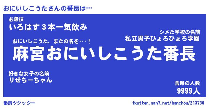 | 男性向けラノベタイトル風あだ名 | 『オニイシコウタアートオンライン』 |