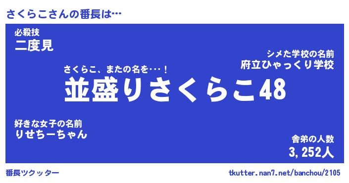 | 意味不明あだ名 | 『ペロリンさくらこ』『永久保存さくらこ』 |
