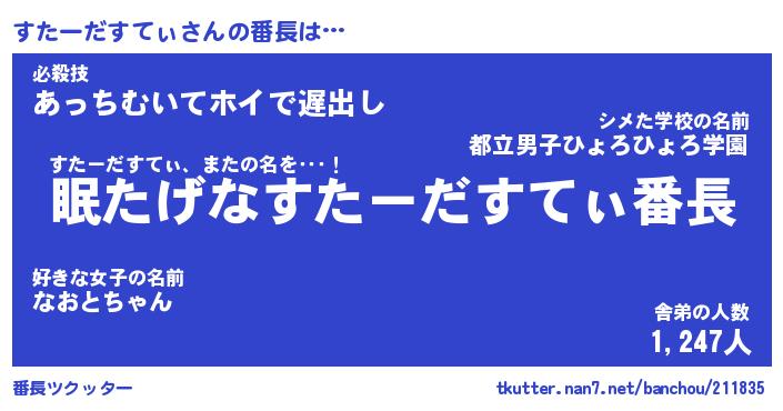 | 伝説のあだ名 | 『封印されしスナイパーすたーだすてぃ』 |