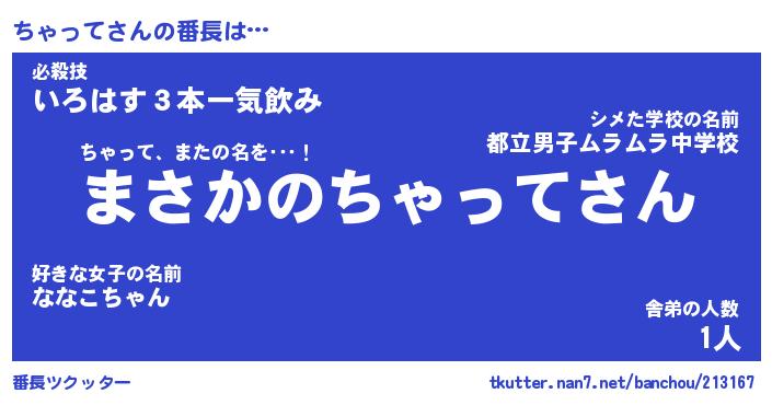 | ヘコむあだ名 | 『ちゃにー』『なまこ酢』『ちゃっ子』 |