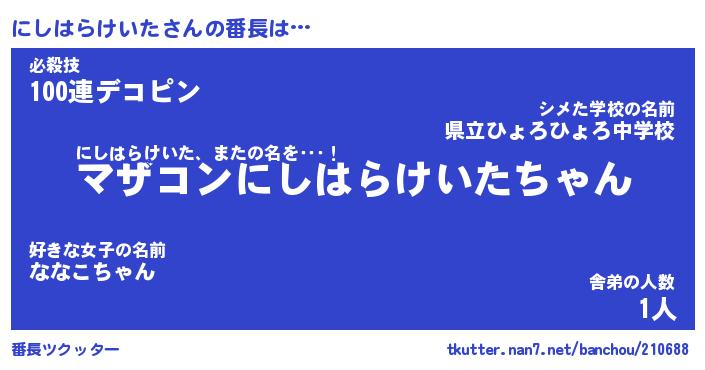 | ヘコむあだ名 | 『にしにゅー』『つくし』『にしお』 |