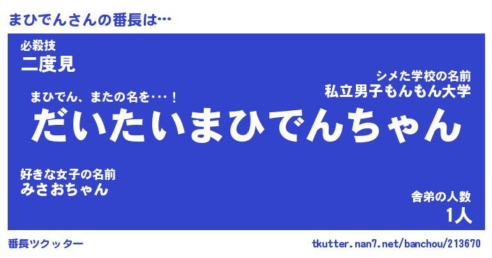 | 意味不明あだ名 | 『ペロリンまひでん』『永久保存まひでん』 |