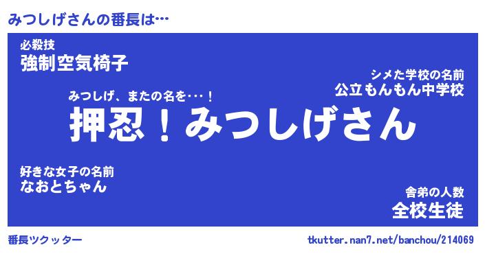 | 伝説のあだ名 | 『封印されしスナイパーみつしげ』 |