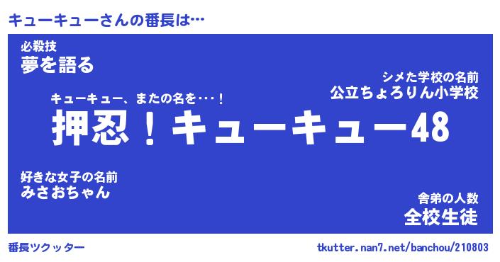 | ヒーロー風カッコイイあだ名 | 『スーパーキューキュー』『銀牙騎士キュ』 |