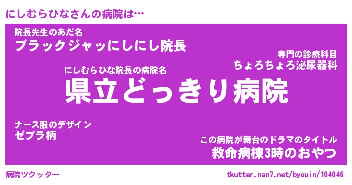 | ヒーロー風カッコイイあだ名 | 『スーパーニシムラヒナ』『天弓騎士ニシ』 |