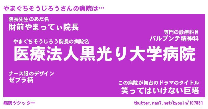 やまぐちそうじろうさんの病院は… やまぐちそうじろう院長の病院名『医療法人黒光り大学病院』院長先生のあだ名『財前やまってぃ院長』この病院が舞台のドラマのタイトル『笑ってはいけない巨塔』 ツクッター #病院ツクッター http://tkutter.nan7.net/byouin/107881/