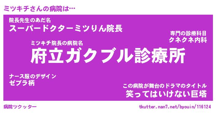 | 2回繰り返すあだ名 | 『ミツミツ』『ミミツツ』『げほげほ』 |