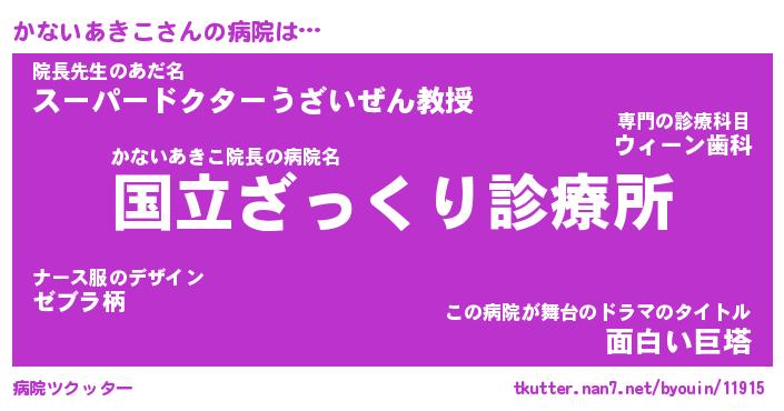 かないあきこさんの病院は… かないあきこ院長の病院名『国立ざっくり診療所』院長先生のあだ名『スーパードクターうざいぜん教授』この病院が舞台のドラマのタイトル『面白い巨塔』 ツクッター #病院ツクッター http://tkutter.nan7.net/byouin/11915/