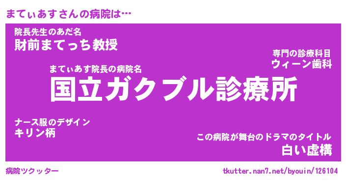まてぃあすさんの病院は… まてぃあす院長の病院名『国立ガクブル診療所』院長先生のあだ名『財前まてっち教授』この病院が舞台のドラマのタイトル『白い虚構』 ツクッター #病院ツクッター http://tkutter.nan7.net/byouin/126104/