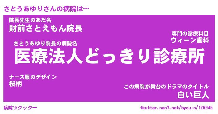 | 恥ずかしいあだ名 | 『プリティーさとうあゆり』『さとっちょ』 |