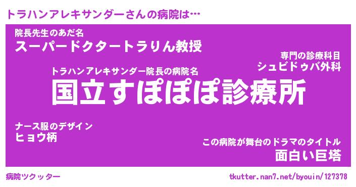 | ツイッター | トラハンアレキサンダーさんのツイッターID『renkon_kun』 |