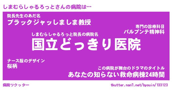 | 伝説のあだ名 | 『伝説のスナイパーしまむらしゃるろっと』 |