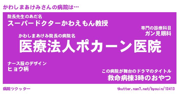 | 恥ずかしいあだ名 | 『プリティーかわしまあけみ』『かわちん』 |