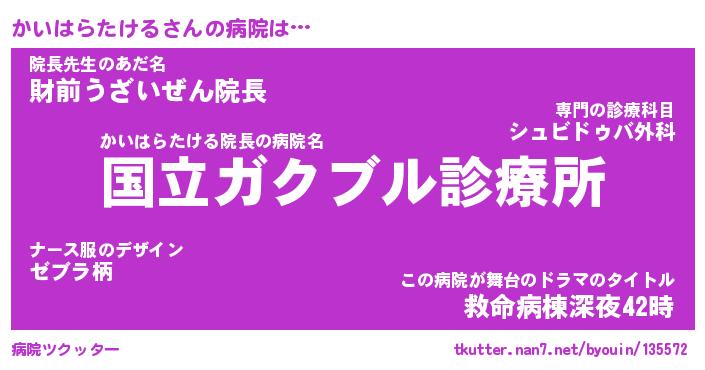| 女子向けラノベタイトル風あだ名 | 『(仮)かいはらたけるのやんごとなき事情』 |