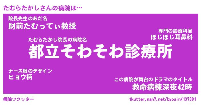 | ツイッター | たむらたかしさんのツイッターID『dendenmushi_star』 |