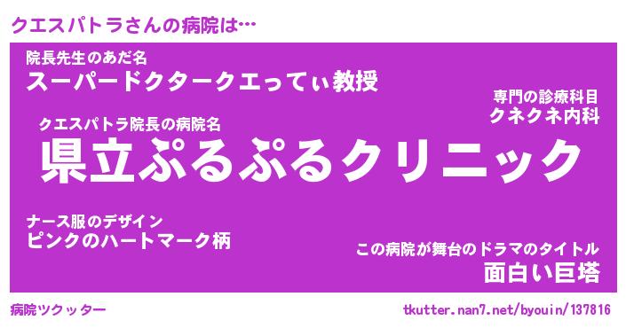 | 恥ずかしいあだ名 | 『プリティークエスパトラ』『クエっちょ』 |