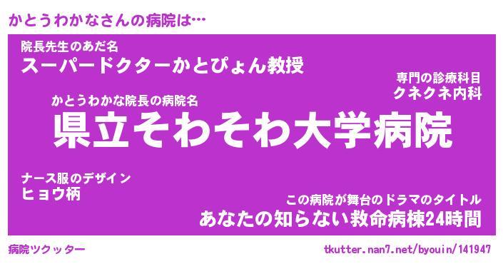 | ヒーロー風カッコイイあだ名 | 『スーパーカトウワカナ』『魔戒騎士カト』 |