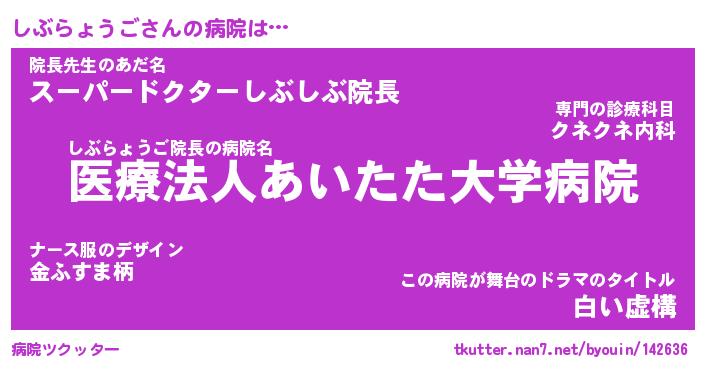 しぶらょうごさんの病院は… しぶらょうご院長の病院名『医療法人あいたた大学病院』院長先生のあだ名『スーパードクターしぶしぶ院長』この病院が舞台のドラマのタイトル『白い虚構』 ツクッター #病院ツクッター http://tkutter.nan7.net/byouin/142636/