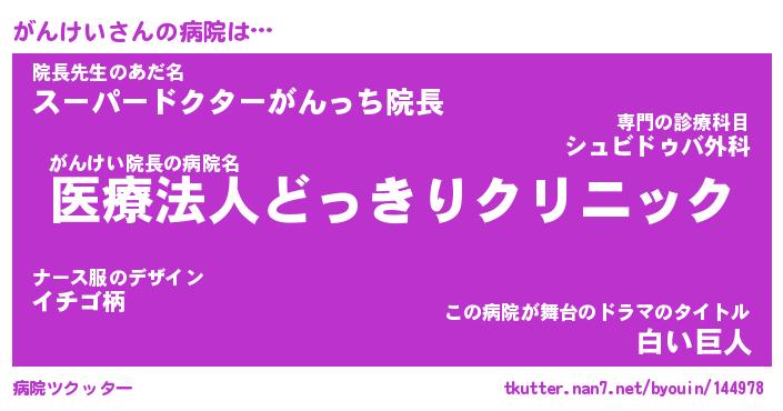 | 女子向けラノベタイトル風あだ名 | 『がんけい姫と円卓の騎士』 |