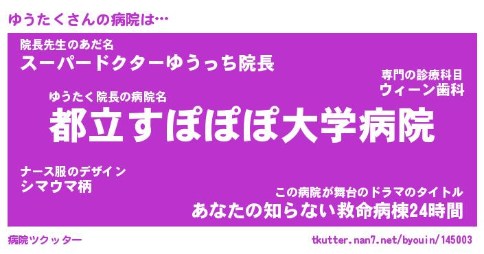 | ファンタジー風あだ名 | 『ユウフェル』『エターナルユウタクー』 |