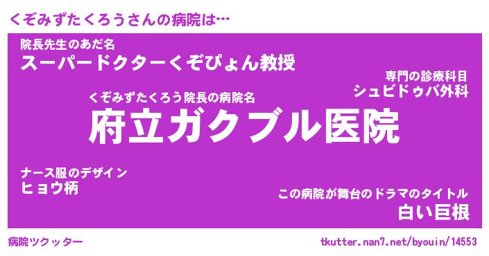 | 男性向けラノベタイトル風あだ名 | 『くぞみずたくろうの憂鬱』 |