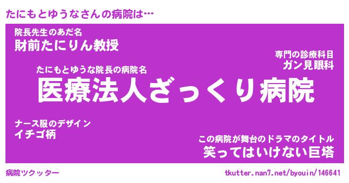 たにもとゆうなさんの病院は… たにもとゆうな院長の病院名『医療法人ざっくり病院』院長先生のあだ名『財前たにりん教授』この病院が舞台のドラマのタイトル『笑ってはいけない巨塔』 ツクッター #病院ツクッター http://tkutter.nan7.net/byouin/146641/