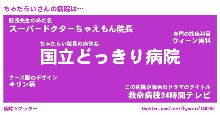 | 伝説のあだ名 | 『伝説のスナイパーちゃたらい』 |