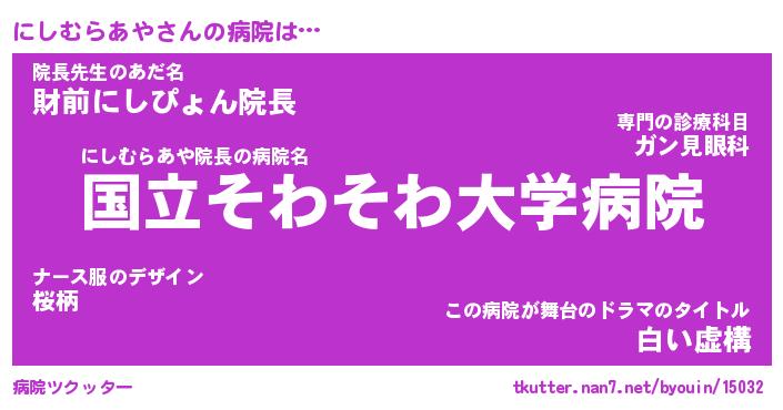 | ヒーロー風カッコイイあだ名 | 『スーパーニシムラアヤ』『銀牙騎士ニシ』 |