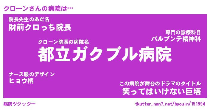 | 意味不明あだ名 | 『ペロリンクローン』『永久保存クローン』 |