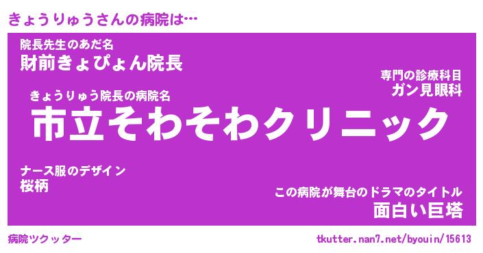きょうりゅうさんの病院は… きょうりゅう院長の病院名『市立そわそわクリニック』院長先生のあだ名『財前きょぴょん院長』この病院が舞台のドラマのタイトル『面白い巨塔』 ツクッター #病院ツクッター http://tkutter.nan7.net/byouin/15613/
