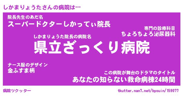 しかまりょうたさんの病院は… しかまりょうた院長の病院名『県立ざっくり病院』院長先生のあだ名『スーパードクターしかってぃ院長』この病院が舞台のドラマのタイトル『あなたの知らない救命病棟24時間』 ツクッター #病院ツクッター http://tkutter.nan7.net/byouin/159077/