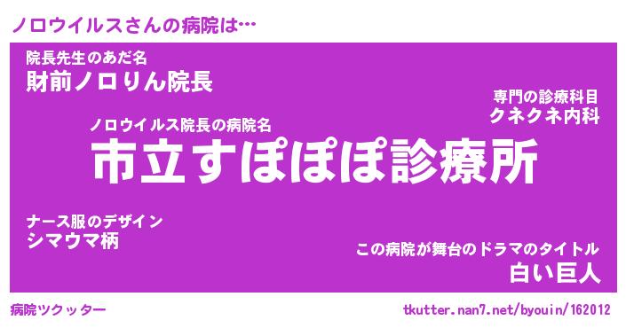 | 伝説のあだ名 | 『伝説のスナイパーノロウイルス』 |