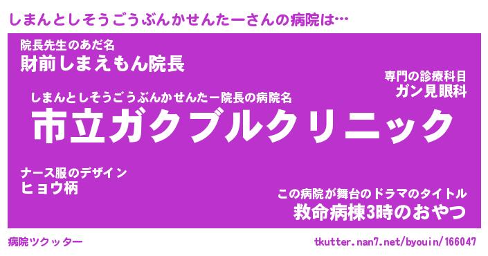 | 男性向けラノベタイトル風あだ名 | 『しまんとしそうごうぶんかせんたーの憂鬱』 |