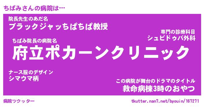 ちぱみさんの病院は… ちぱみ院長の病院名『府立ポカーンクリニック』院長先生のあだ名『ブラックジャッちぱちぱ教授』この病院が舞台のドラマのタイトル『救命病棟3時のおやつ』 ツクッター #病院ツクッター http://tkutter.nan7.net/byouin/167271/