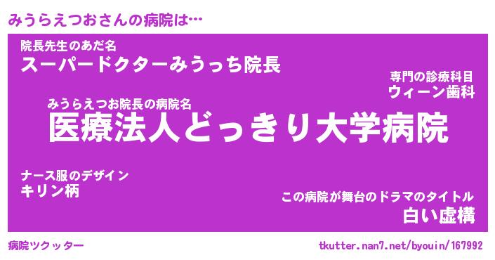 | 女子向けラノベタイトル風あだ名 | 『誰かこのみうらえつおを説明してください! ~契約から始まるウェディング~』 |