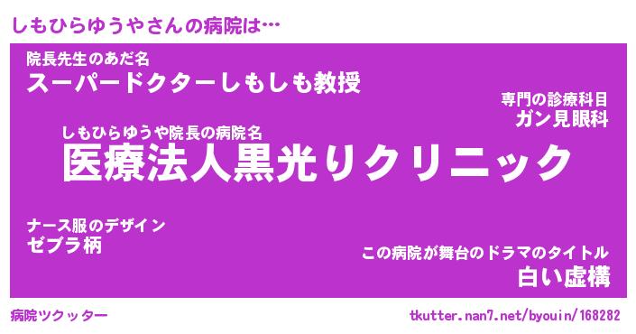 | 胡散臭い通販商品みたいなあだ名 | 『億万長者になれるブレスレット…その名も「しもひらゆうや」』 |
