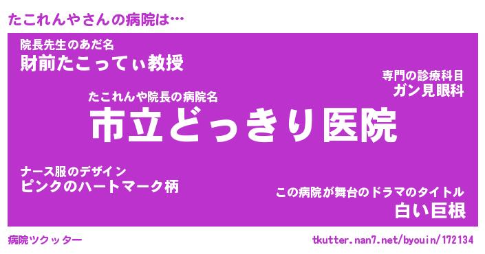 たこれんやさんの病院は… たこれんや院長の病院名『市立どっきり医院』院長先生のあだ名『財前たこってぃ教授』この病院が舞台のドラマのタイトル『白い巨根』 ツクッター #病院ツクッター http://tkutter.nan7.net/byouin/172134/