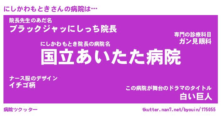 | 男性向けラノベタイトル風あだ名 | 『にしかわもときの憂鬱』 |