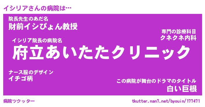 | 意味不明あだ名 | 『ペロリンイシリア』『永久保存イシリア』 |