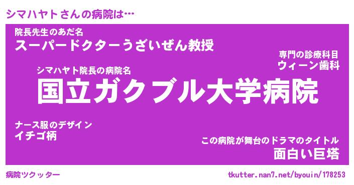 | ファンタジー風あだ名 | 『シマフェル』『エターナルシマハヤトー』 |