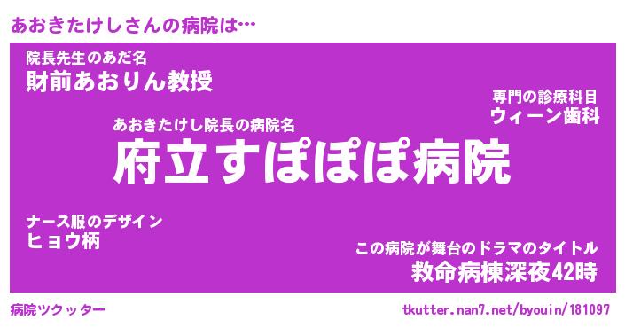 | 恥ずかしいあだ名 | 『プリティーあおきたけし』『あおっちょ』 |