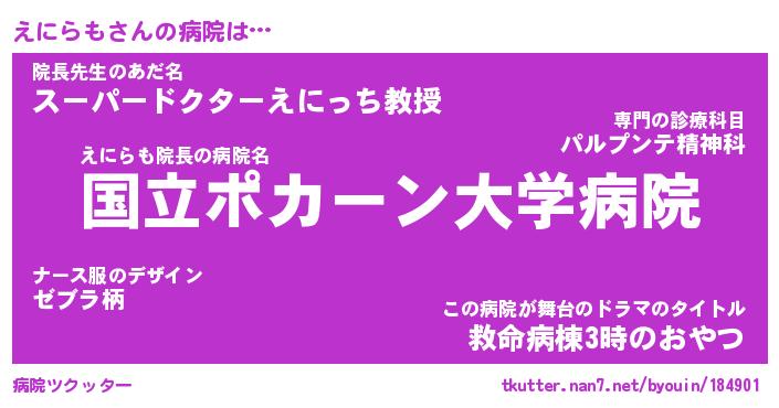 | 意味不明あだ名 | 『ペロリンえにらも』『永久保存えにらも』 |