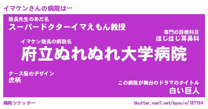 | 意味不明あだ名 | 『ペロリンイマケン』『永久保存イマケン』 |