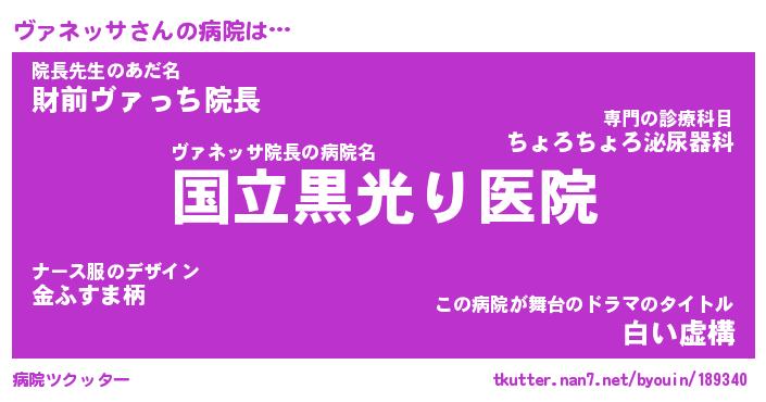 ヴァネッサさんの病院は… ヴァネッサ院長の病院名『国立黒光り医院』院長先生のあだ名『財前ヴァっち院長』この病院が舞台のドラマのタイトル『白い虚構』 ツクッター #病院ツクッター http://tkutter.nan7.net/byouin/189340/