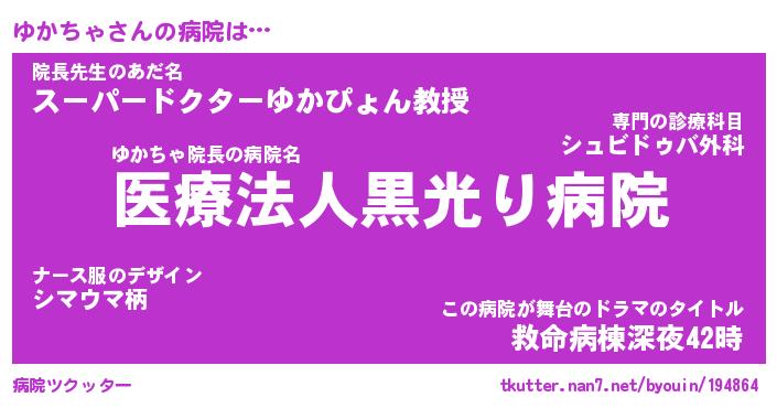ゆかちゃさんの病院は… ゆかちゃ院長の病院名『医療法人黒光り病院』院長先生のあだ名『スーパードクターゆかぴょん教授』この病院が舞台のドラマのタイトル『救命病棟深夜42時』 ツクッター #病院ツクッター http://tkutter.nan7.net/byouin/194864/