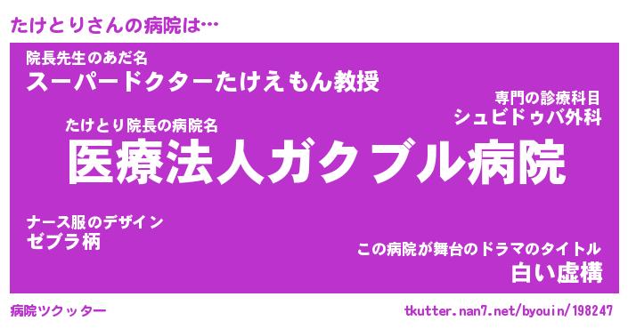 | 意味不明あだ名 | 『ペロリンたけとり』『永久保存たけとり』 |