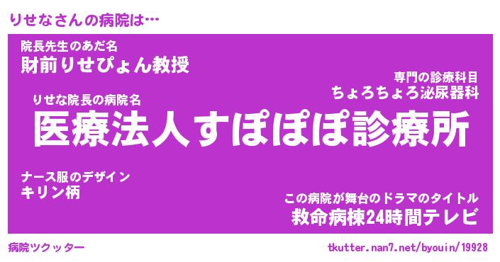 りせなさんの病院は… りせな院長の病院名『医療法人すぽぽぽ診療所』院長先生のあだ名『財前りせぴょん教授』この病院が舞台のドラマのタイトル『救命病棟24時間テレビ』 ツクッター #病院ツクッター http://tkutter.nan7.net/byouin/19928/