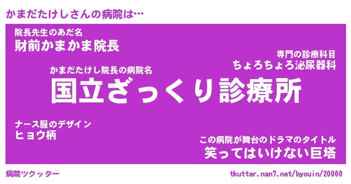 かまだたけしさんの病院は… かまだたけし院長の病院名『国立ざっくり診療所』院長先生のあだ名『財前かまかま院長』この病院が舞台のドラマのタイトル『笑ってはいけない巨塔』 ツクッター #病院ツクッター http://tkutter.nan7.net/byouin/20060/