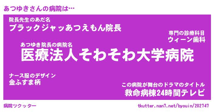 | 意味不明あだ名 | 『ペロリンあつゆき』『永久保存あつゆき』 |