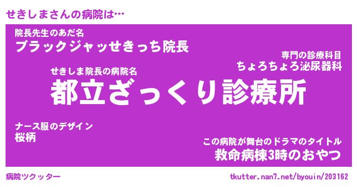 | ヘコむあだ名 | 『せきもー』『なまこ酢』『せき太郎』 |